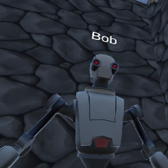 a game where you push off and grab surfaces to move as a robot and play various sports in an arena.